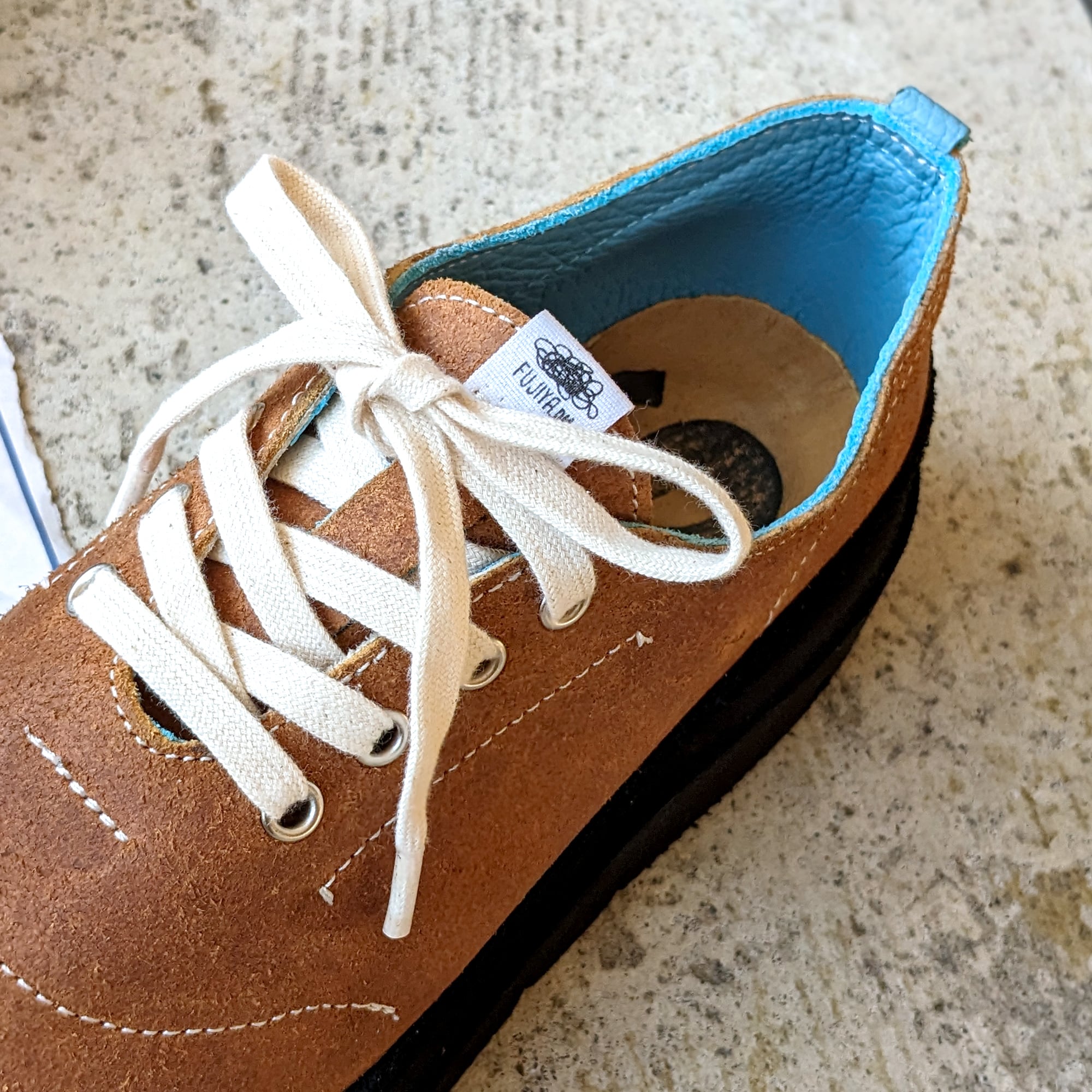 無骨な風合いだけでなく、さりげなく洗練を感じさせるのは、ちらりと見える裏地のターコイズブルー。脱いで置いてある姿も様になるそんな一足です。